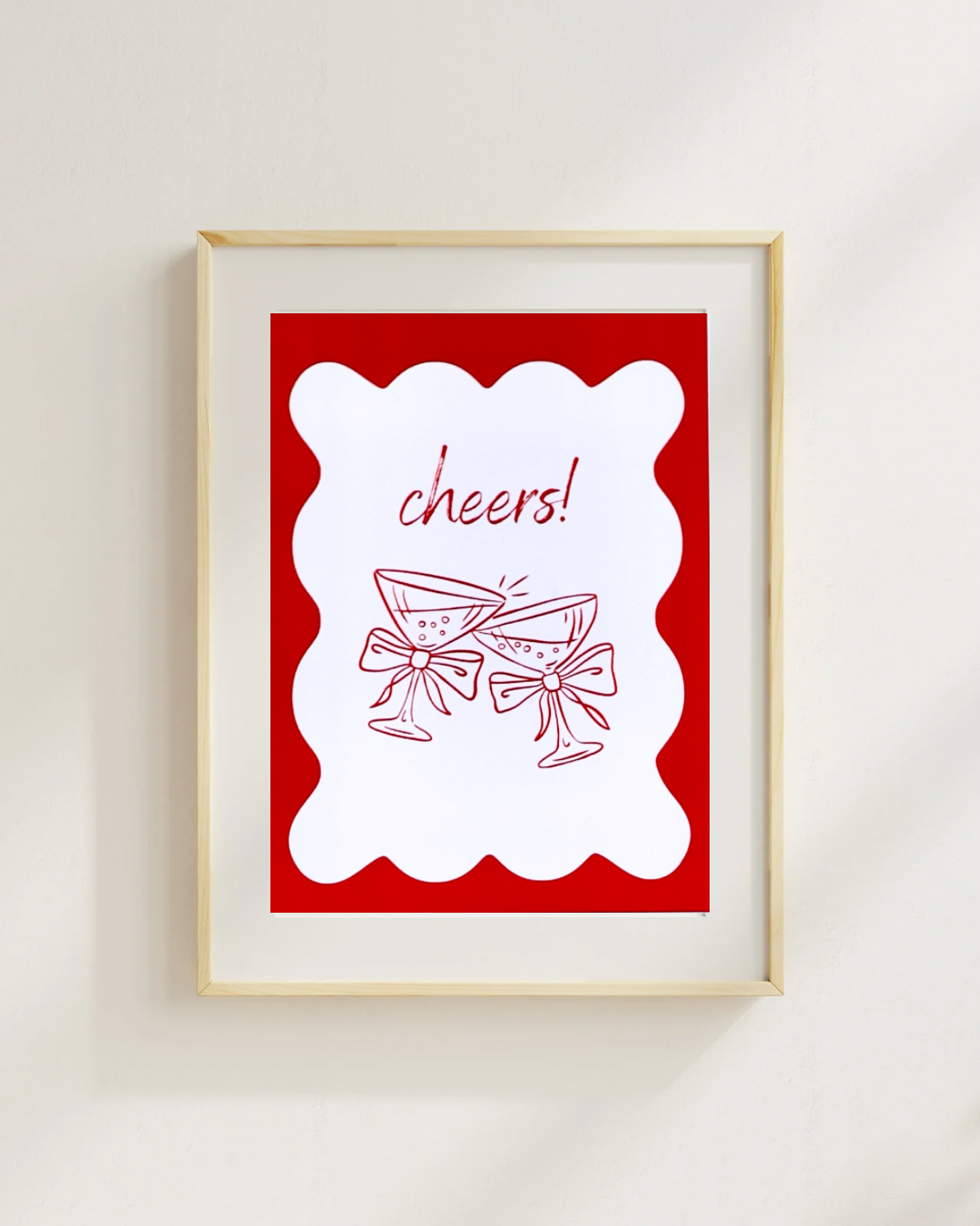 Celebrate the season (or any special moment!) with this playful Clinking Martinis – Cheers! print. Featuring two martini glasses clinking together with a cute bow accent, framed by a bold red wavy border, this artwork adds a fun, festive vibe to any space.
